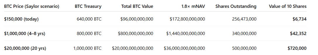 This is perfectly aligned with Saylors ~31.6% per year for Bitcoin, a 244x return. I figured that good management (Saylor’s is good) deserves a premium, so I assumed the market would value MSTR at a 1.80x the value of its total Bitcoin holdings. I think BTC will → $1M eventually and I standby this prediction. But Bitcoin → $20,000,000… not happening…